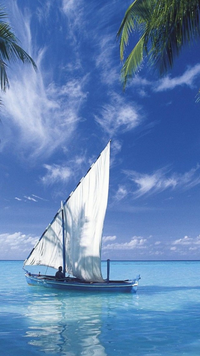 Кокосовые пальмы, синие облака, морской пейзаж, судно - iPhone 5/5S (& iPod)