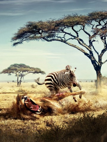 Голодный лев повален зеброй Чейз HD обои - 360x480