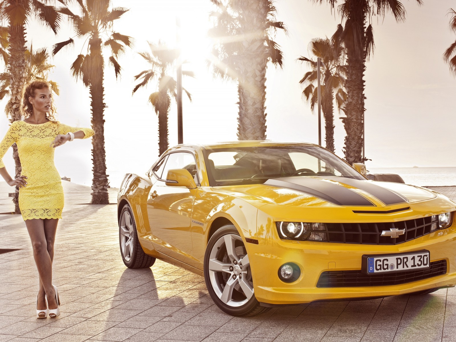 Девушка возле жёлтого Камаро обои - 1600x1200