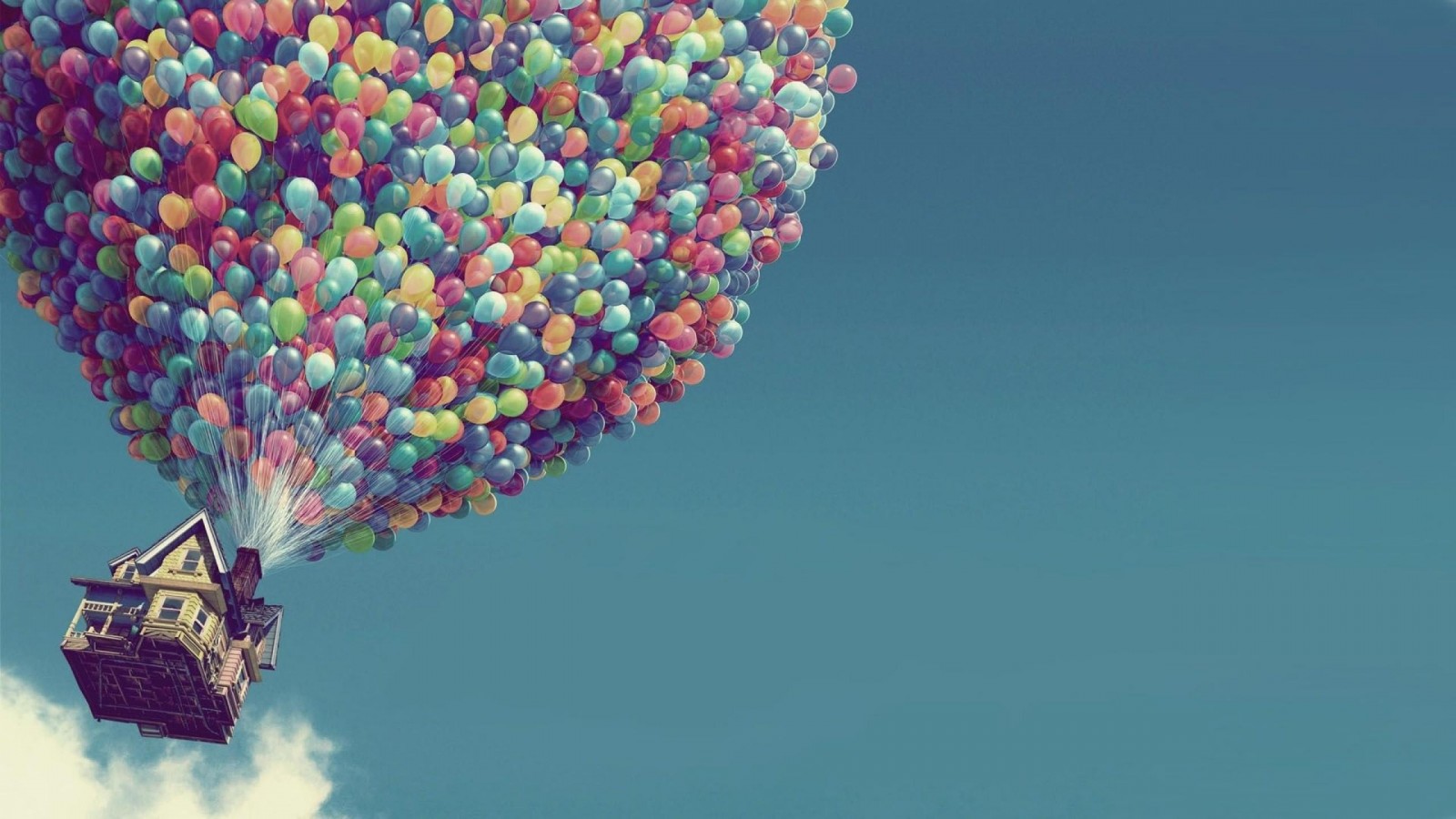Дом взлетел в небо на воздушных шариках - 1600x900
