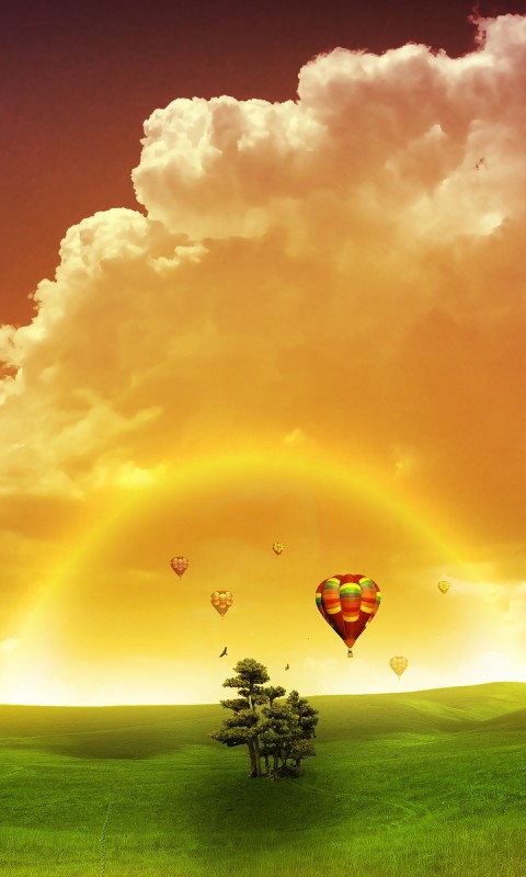 Желтое небо, закат, воздушный шар, 3Д, 3D, фэнтези - 480x800