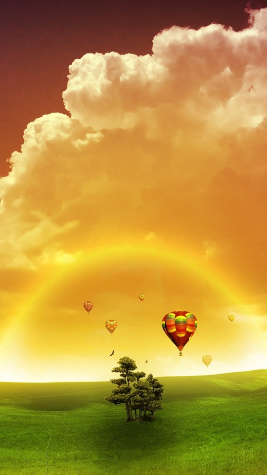 Желтое небо, закат, воздушный шар, 3Д, 3D, фэнтези - 540x960