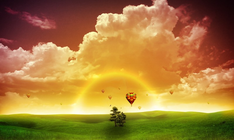Желтое небо, закат, воздушный шар, 3Д, 3D, фэнтези - 800x480