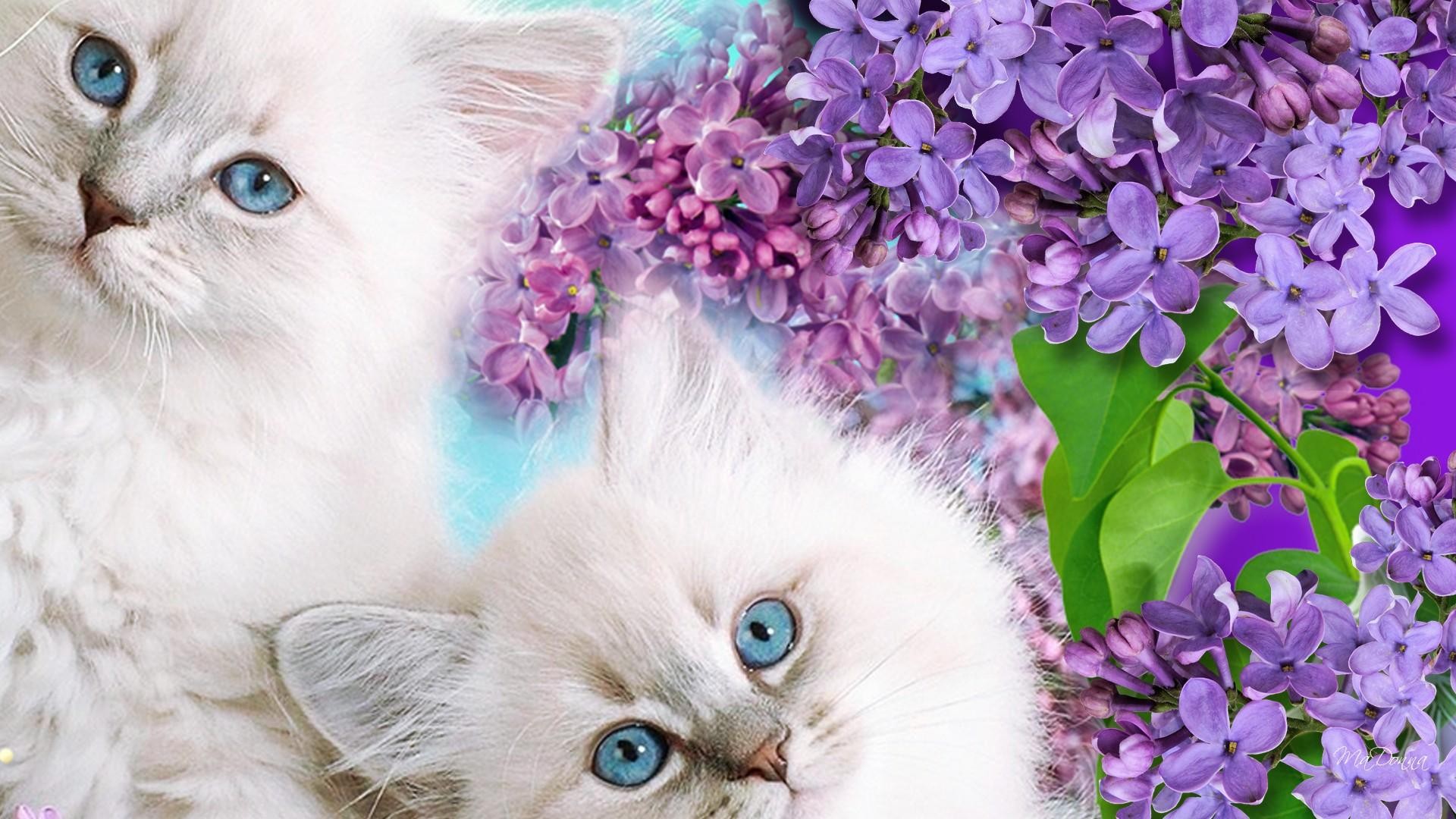 Красивые белые пушистые котята на фоне цветов - 1920x1080 (1080p)