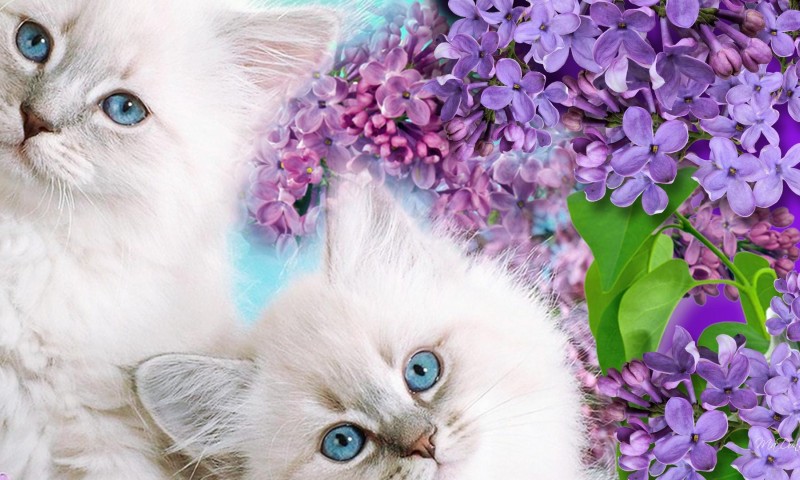 Красивые белые пушистые котята на фоне цветов - 800x480