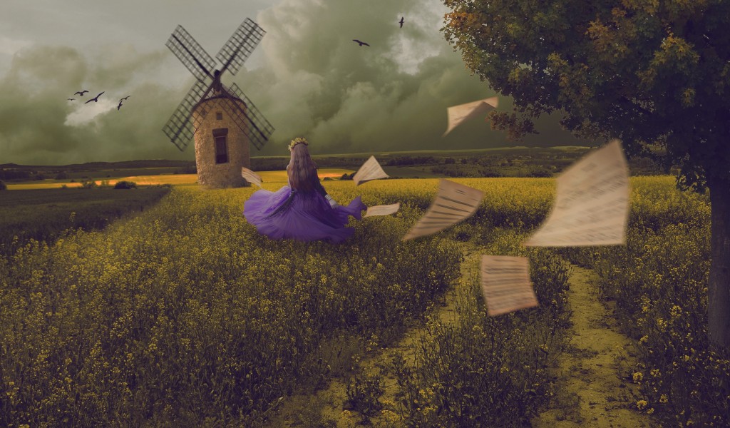 Мельница, сказочная девушка, поляна, платье, картинки - 1024x600