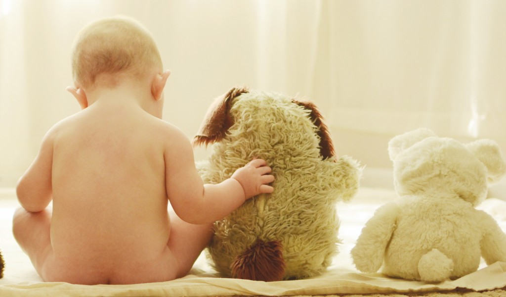 Обои голенького малыша с плюшевыми игрушками - 1024x600