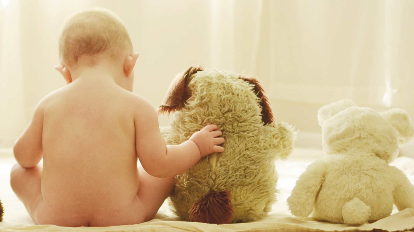 Обои голенького малыша с плюшевыми игрушками - 1600x900