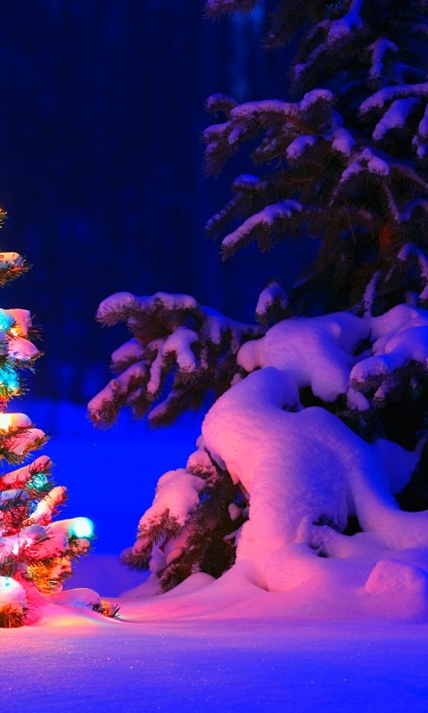 Праздник в лесу украшенная елка для Нового года и Рождества обои - 480x800