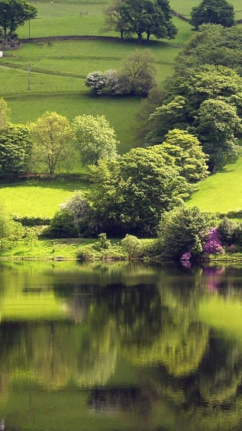 Река, трава, деревья, луг, холмы, фоны, заставки - 480x854