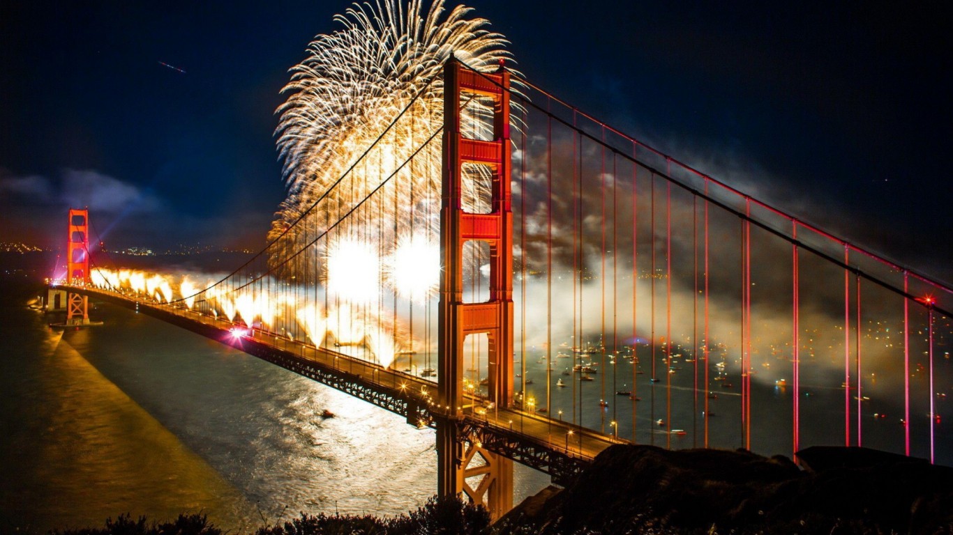 Салют на мосту Золотые Ворота Сан-Франциско - 1366x768