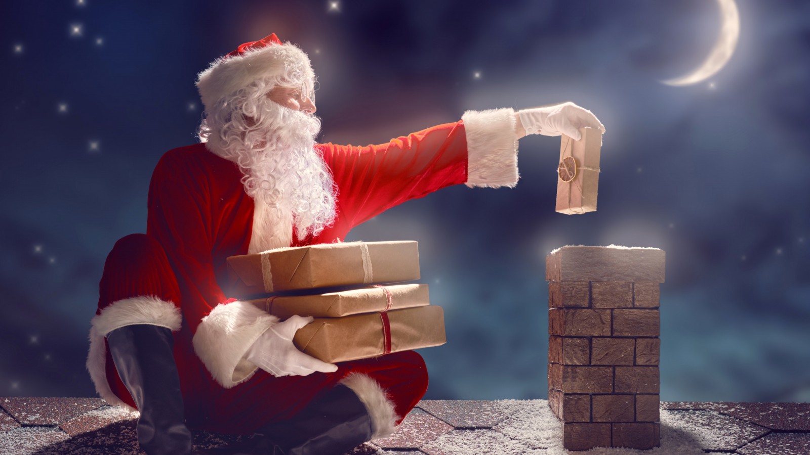 Санта Клаус кидает подарки через дымоход картинки - 1600x900