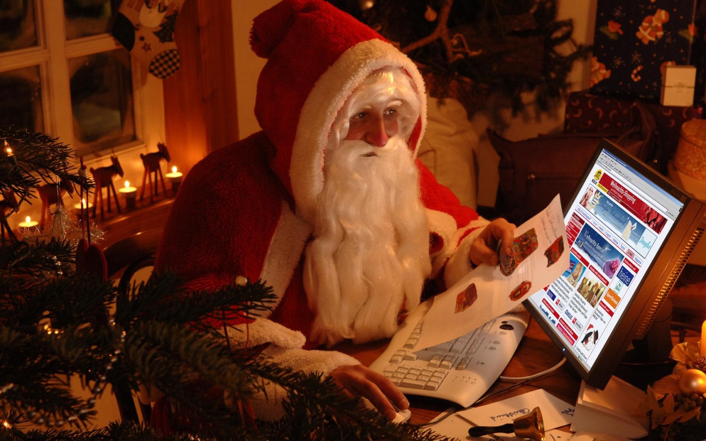 Санта-Клаус, новый год, подарки, HD обои, интернет-магазин, Дед мороз покупает подарки в интернет магазине картинки - 1440x900