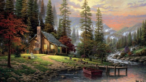 Томас Кинкейд, тихий лесной дом, собака пейзаж, река, картинки фоны - 480x272 PSP