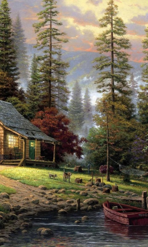 Томас Кинкейд, тихий лесной дом, собака пейзаж, река, картинки фоны - 480x800