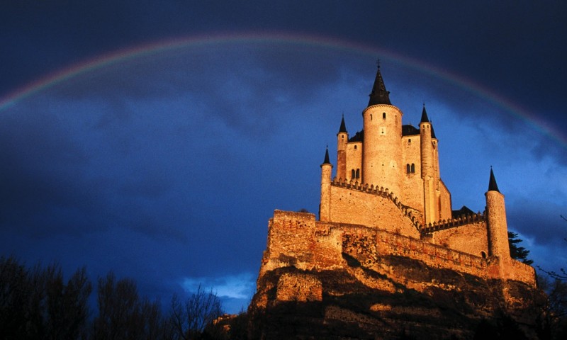 Фото замка из оранжевого камня и радуги - 800x480