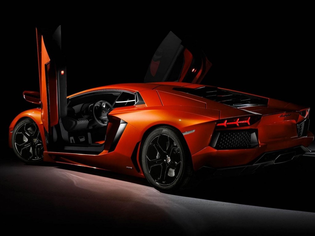 Фото оранжевого Ламборгини с открытыми дверями - 1024x768