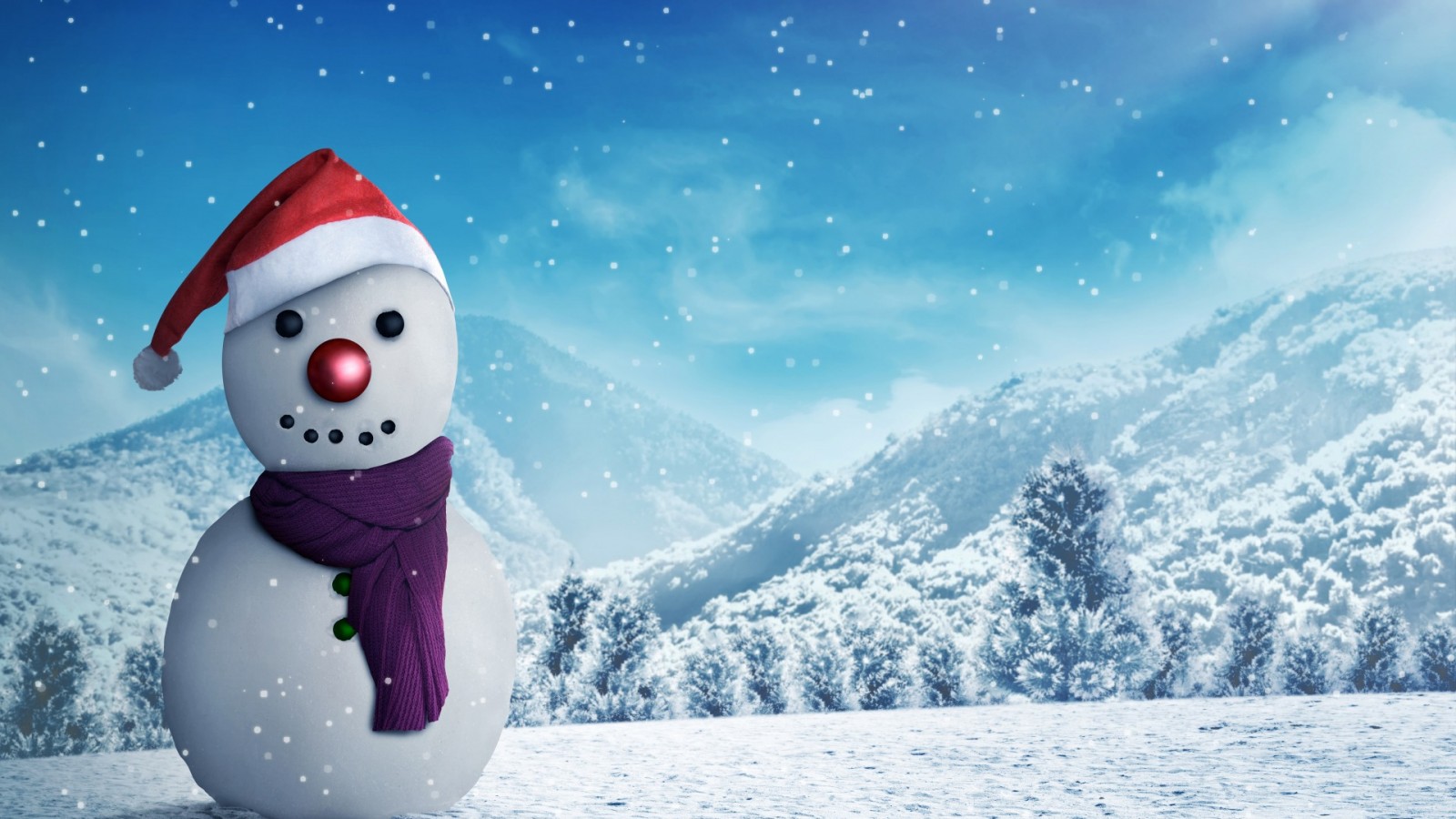 снеговик, деревья, зима, снег, горы, рендеринг, лес, пейзаж, Новый год, шарф, 3D, поляна, шапка, снежинки, снеговичок, рождество - 1600x900