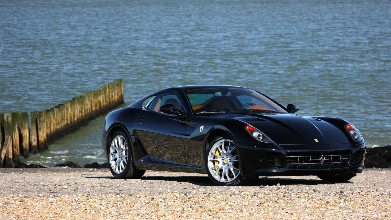 Ferrari, черный, вид спереди, пляж - 1600x900