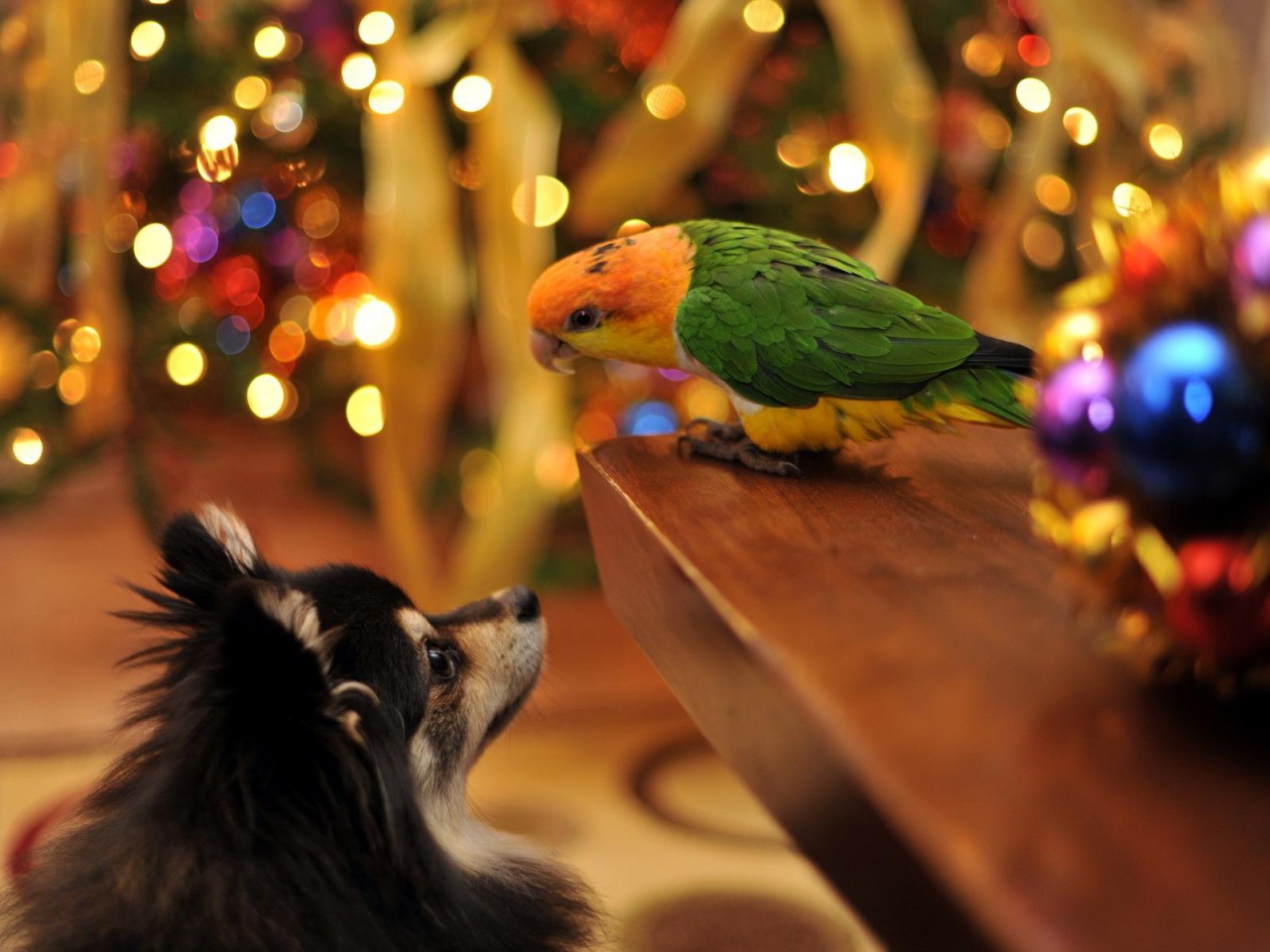hd обои собака и попугай друзья на Новый год и Рождество - 1280x960