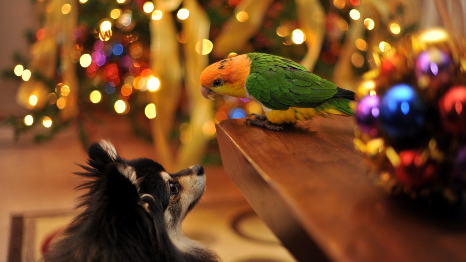 hd обои собака и попугай друзья на Новый год и Рождество - 1600x900
