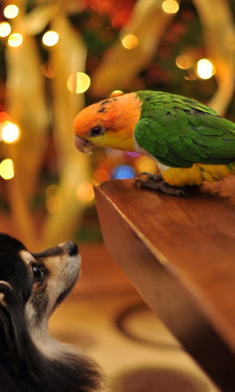 hd обои собака и попугай друзья на Новый год и Рождество - 480x800