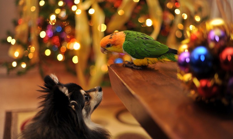 hd обои собака и попугай друзья на Новый год и Рождество - 800x480